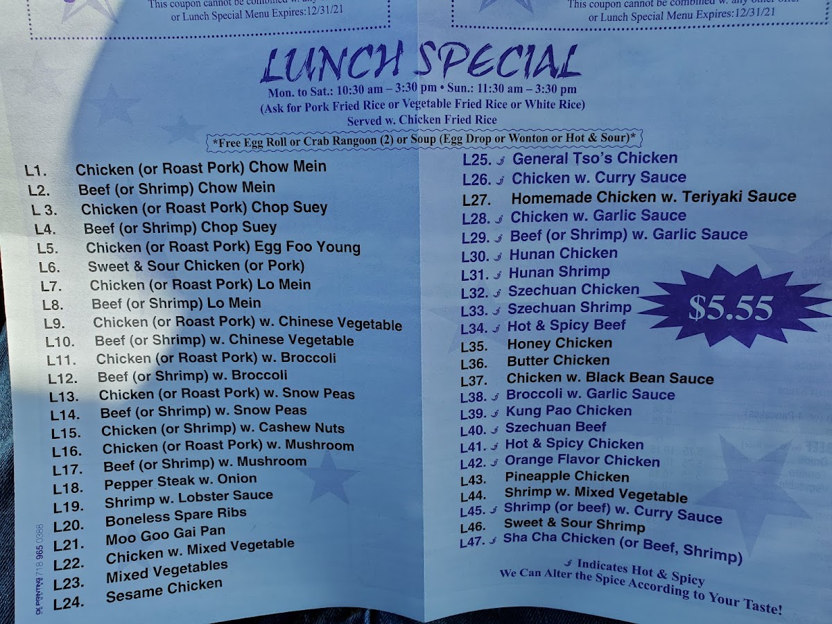 The menu at China Star in Sheboygan offers a delightful selection of dishes that cater to a wide range of tastes. For those looking for a quick, satisfying meal, their Lunch Specials are a great option. Choices like Chicken (or Roast Pork) Chow Mein and Beef (or Shrimp) Chow Mein are perfect for fans of stir-fried noodles, while the Chicken (or Roast Pork) Chop Suey and Beef (or Shrimp) Chop Suey offer a delicious combination of savory vegetables and tender meats. If you're in the mood for something a bit different, the Chicken (or Roast Pork) Egg Foo Young is a flavorful, hearty choice, perfect for a lighter meal. For those seeking variety, the Nation Platter: Shew Nuts provides a crispy, savory snack that’s sure to satisfy.