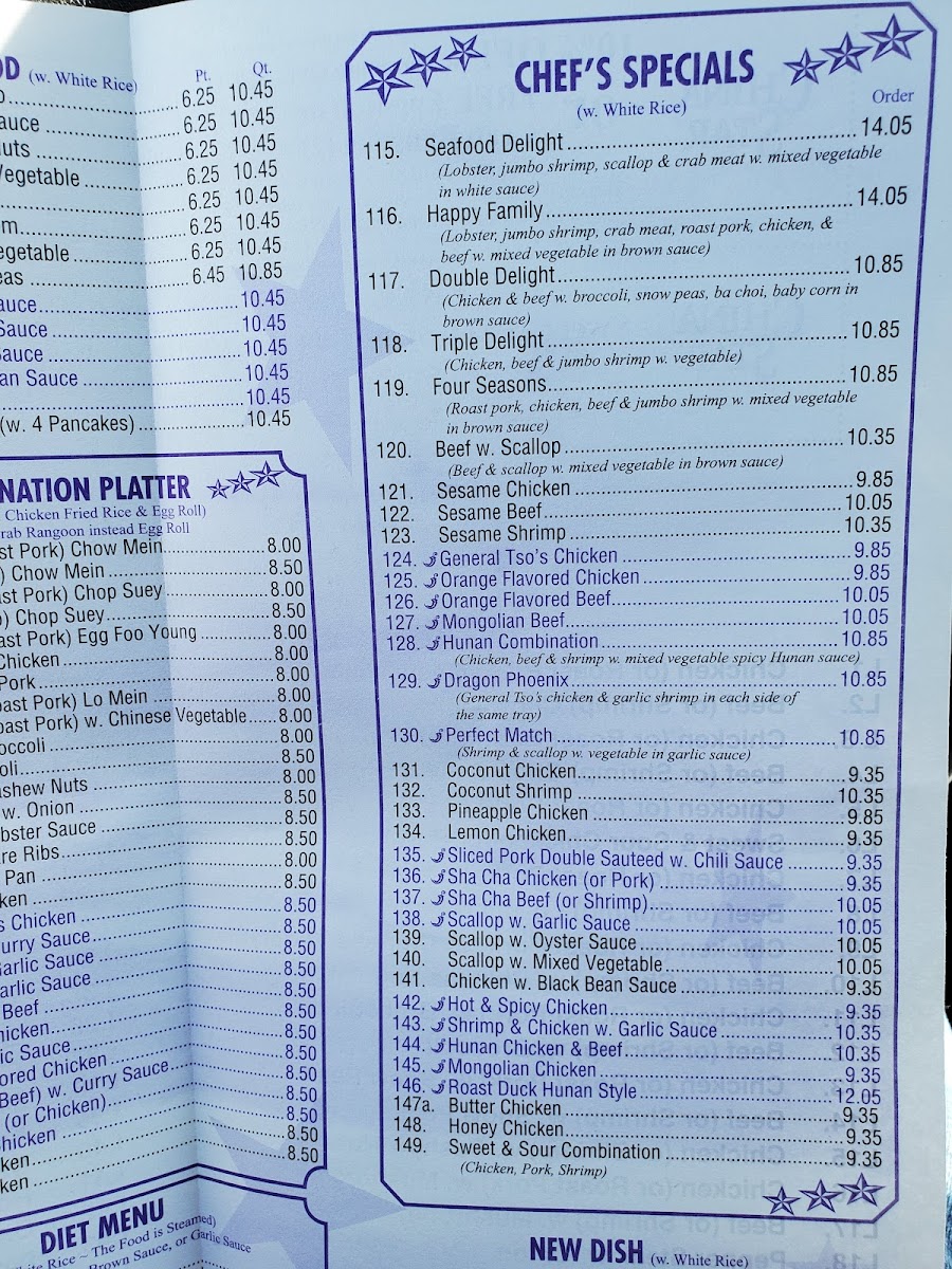 The Chef's Specials bring out some of the most impressive dishes, including the Seafood Delight, packed with fresh seafood, and the Happy Family, a perfect mix of meat and vegetables. The Double Delight and Four Seasons are great for those who love a variety of flavors, featuring a balance of meats and seasonings. Meanwhile, Beef W. Scallop offers a unique combination of beef and scallops for a truly decadent meal.